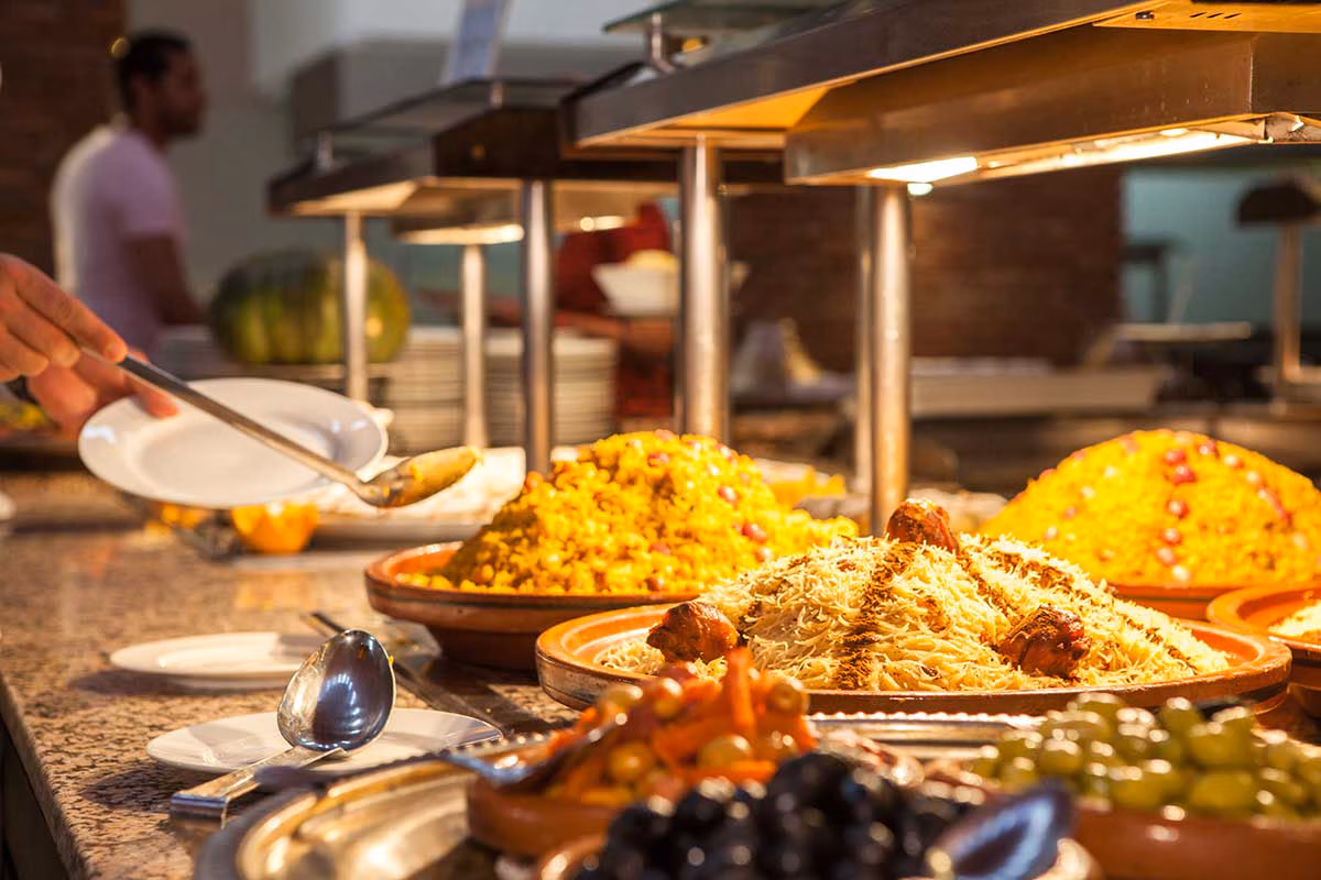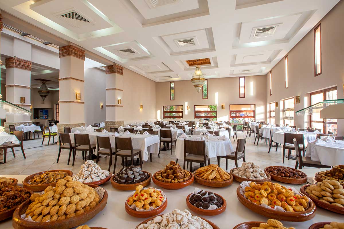 Au Tanjia, le restaurant principal du Valeria Madina Club All Inclusive, chaque repas est une célébration des sens. Dès votre arrivée, laissez-vous envoûter par la présentation soignée des buffets, véritables œuvres d’art culinaires préparées avec soin pour chaque occasion.